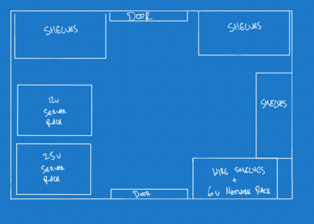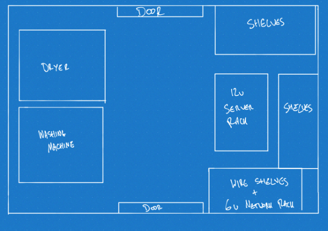 My virtualization lab, networking gear, NAS and AV backbone is an absolute mess. The current 12u server rack is full, the 6u network rack has stuff sitting not just in it but on top of it, and it’s all a real mess down there. Lots of wasted space, awkward network and power runs, and poor use of the large mesh storage shelves in that area. I’d like to store other stuff in that space, and sitting the 6u rack unit on top of wire mesh shelves with printer/AV equipment underneath just doesn’t work.