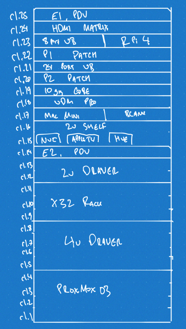 I think that’s the plan. It doesn’t rely on me adding a whole bunch of new equipment (the only new stuff is the 25u rack, one more patch panel and a third PDU), and it should have some space for me to rearrange things and expand (the drawers can come out in the future, the fractal design case can be collapsed down into 2u)