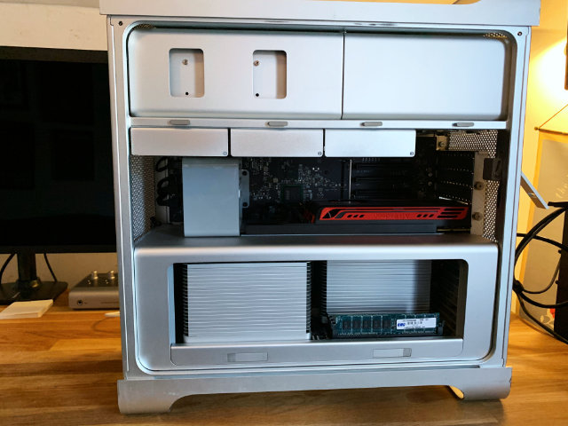 Since the RX 580 isn’t mac flashed (this era of Macs ran non standard extensible firmware interface (EFI), not to be confused with the now ubiquitous UEFI. The generic RX 580 doesn’t know how to display video during the EFI stage of booting, so no video at the boot prompt), I’ll be flying blind here. Flashing power LED, long tone, and the optical drive opening and closing are the only indicators to the process.